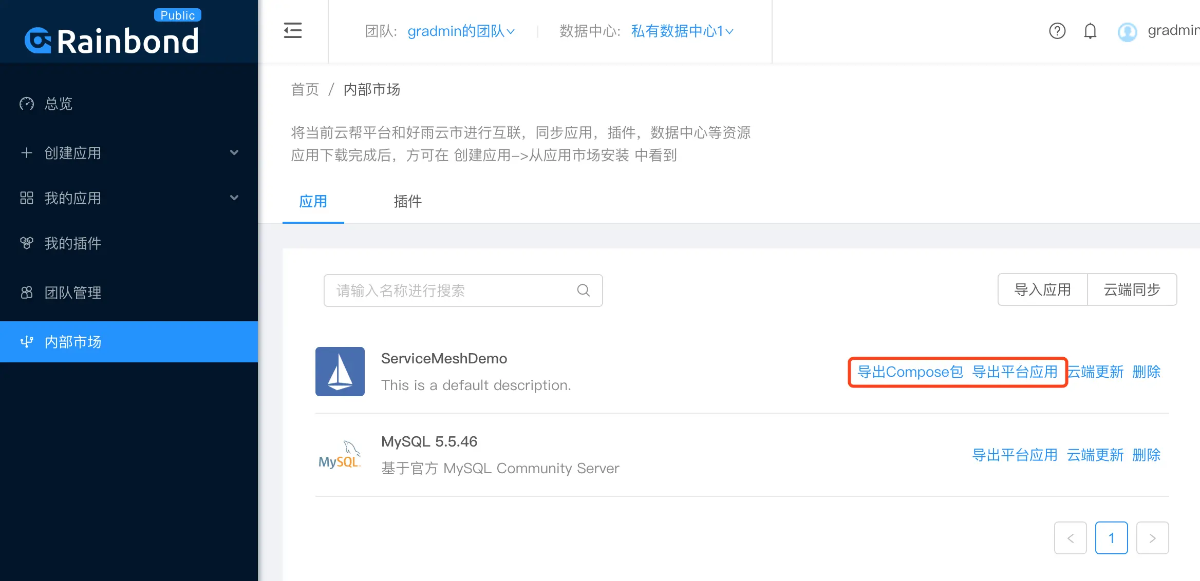 - 内部应用市场应用的导出,可导出兼容docker-compose或可导入Rainbond平台的rainbondApp应用包