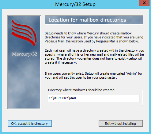 5.邮件存储路径,默认C:\MERCURY\MAIL,请点击 OK, accept this dirctory