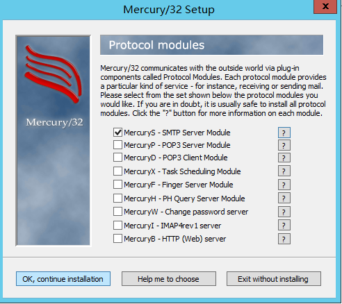 6.协议组件,本例仅发信,所以只勾 MercuryS,请点击 OK, continue installation