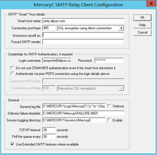 16.在MercuryCSMTP Relay Client Configureation里,填写阿里云邮箱账户关键信息,如 smart host name 里填写smtp.aliyun.com,connection port里填写465,模式选择 SSL encryption using directconnection,Login username里填写阿里云邮箱账户,Password里填写密码
