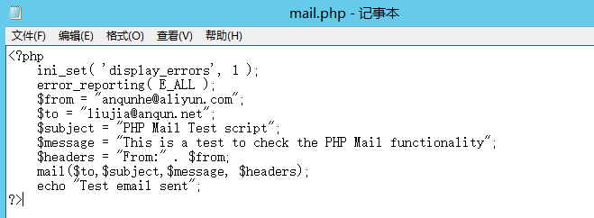 19.在php里用mail函数发送测试,注意from里要填写阿里云账号的地址