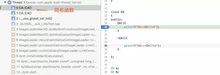 上面的代码中可以看出,系统在编译时分别实现了2个构造函数和析构函数,而且标号为1的函数内部其实只是简单的调用了标号为2的真实函数的实现。所以当我们在调试或者查看崩溃日志时,如果问题出现在了全局对象的构造函数或者析构函数内部,我们看到的函数调用栈里面会出现两个相同的函数名字