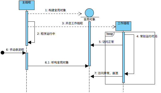 这个来之不易的崩溃信息起了非常大的作用,根据汇编代码按图索骥,并和对方进行交流定位到了对应的源代码。第三方库的一个线程是一个常驻线程,它会周期性并且高频的访问一个全局C++对象实例的数据,出现奔溃的原因就是这个全局C++对象的类的构造函数中从堆里面分配了一块内存,而当进程被终止这个过程中,这个全局对象被析构,析构函数中会将分配的堆内存进行回收。但是那个常驻线程因为此刻还没有被终止,它还像往常一样继续访问这个已经被析构了的全局对象的堆内存,从而导致了上面图中的内存地址访问非法的问题。下面就是问题发生的过程: