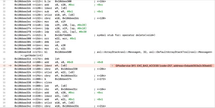 Hardware Model: iPhone7,2Code Type: ARM-64Parent Process: ? [1]Date/Time: 2018-05-10 10:22:32.000 +0800OS Version: iOS 10.3.3 (14G60)Report Version: 104Exception Type: EXC_BAD_ACCESS (SIGBUS)Exception Codes: 0x00000000 at 0xbadd0c44f948beb5Crashed Thread: 33//并非崩溃在主线程,而是用户执行了杀掉应用的操作。下面主线程的调用栈可以看出是用户主动杀死的进程。Thread 0:0 xxxx xxxx::Threads::Synchronization::AppMutex::~AppMutex() (xxxx.cpp:58)1 libsystem_c.dylib __cxa_finalize_ranges + 3842 libsystem_c.dylib exit + 243 UIKit +[_UIAlertManager hideAlertsForTermination] + 04 UIKit __102-[UIApplication _handleApplicationDeactivationWithScene:shouldForceExit:transitionContext:completion:]_block_invoke.2093 + 7925 UIKit _runAfterCACommitDeferredBlocks + 2926 UIKit _cleanUpAfterCAFlushAndRunDeferredBlocks + 5287 UIKit _afterCACommitHandler + 1328 CoreFoundation __CFRUNLOOP_IS_CALLING_OUT_TO_AN_OBSERVER_CALLBACK_FUNCTION__ + 329 CoreFoundation __CFRunLoopDoObservers + 37210 CoreFoundation __CFRunLoopRun + 95611 CoreFoundation CFRunLoopRunSpecific + 42412 GraphicsServices GSEventRunModal + 10013 UIKit UIApplicationMain + 20814 xxxx main (main.m:36)15 libdyld.dylib start + 4/* 崩溃的线程调用栈,出现崩溃的机器指令段如下: 0x106bee318: add x8, x0, #0x8 0x106bee31c: ldaxr w9,[x8] 注意看下面的x0,x8寄存器中的值已经是异常的数字了,这里对异常地址进行读取操作产生了崩溃*/Thread 33 name: xxxxThread 33 Crashed:0 xxxx xxxx::Message::recycle() + 1841 xxxx xxxx::Message::recycle() + 1762 xxxx xxxx::BaseMessageLooper::onProcMessage(xxxx::Message*) + 1923 xxxx xxxx::Looper::loop() + 604 xxxx xxxx::MessageThread::run() + 965 xxxx xxxx::Thread::runCallback(void*) + 1086 libsystem_pthread.dylib _pthread_body + 2407 libsystem_pthread.dylib _pthread_body + 0Thread 33 crashed with ARM-64 Thread State: cpsr: 0x00000000a0000000 fp: 0x000000017102ae60 lr: 0x00000001018744c4 pc: 0x00000001018744cc sp: 0x000000017102ae40 x0: 0xbadd0c44f948bead x1: 0x0000000000000000 x10: 0x0000000000000000 x11: 0x0000000102a50178 x12: 0x000000000000002c x13: 0x000000000000002c x14: 0x0000000102a502d8 x15: 0x0000000000000000 x16: 0x0000000190f3fa1c x17: 0x010bcb01010bcb00 x18: 0x0000000000000000 x19: 0x00000001744a2460 x2: 0x0000000000000008 x20: 0x00000001027da5b8 x21: 0x0000000000000000 x22: 0x0000000000000001 x23: 0x0000000000025903 x24: 0x0000000000000000 x25: 0x0000000000000000 x26: 0x0000000000000000 x27: 0x0000000000000000 x28: 0x0000000000000000 x29: 0x000000017102ae60 x3: 0x0000000190f4f2c0 x4: 0x0000000000000002 x5: 0x0000000000000008 x6: 0x0000000000000000 x7: 0x00000000010bcb01 x8: 0xbadd0c44f948beb5 x9: 0x0000000000000000
