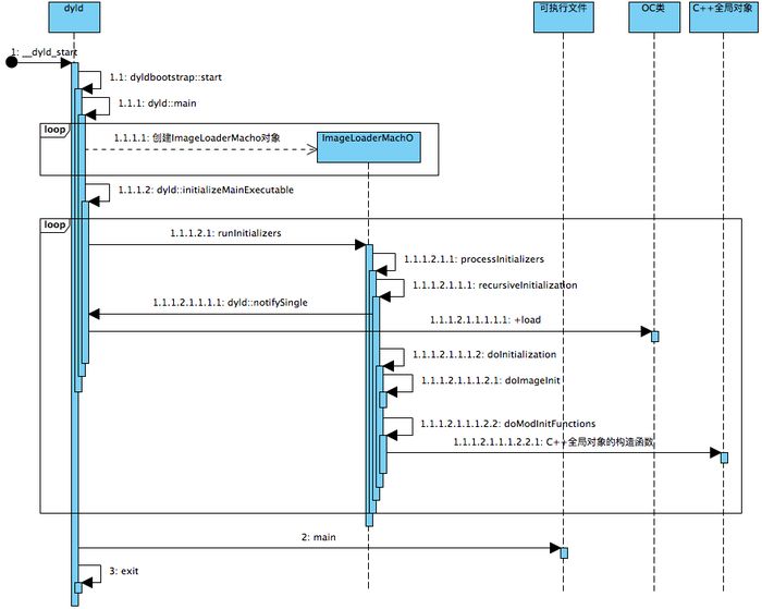 dyldbootstrap::start函数执行所有库的初始化,执行所有OC类的+load的方法,执行所有C++全局对象的构造函数,执行带有_attribute_(constructor)定义的C函数。