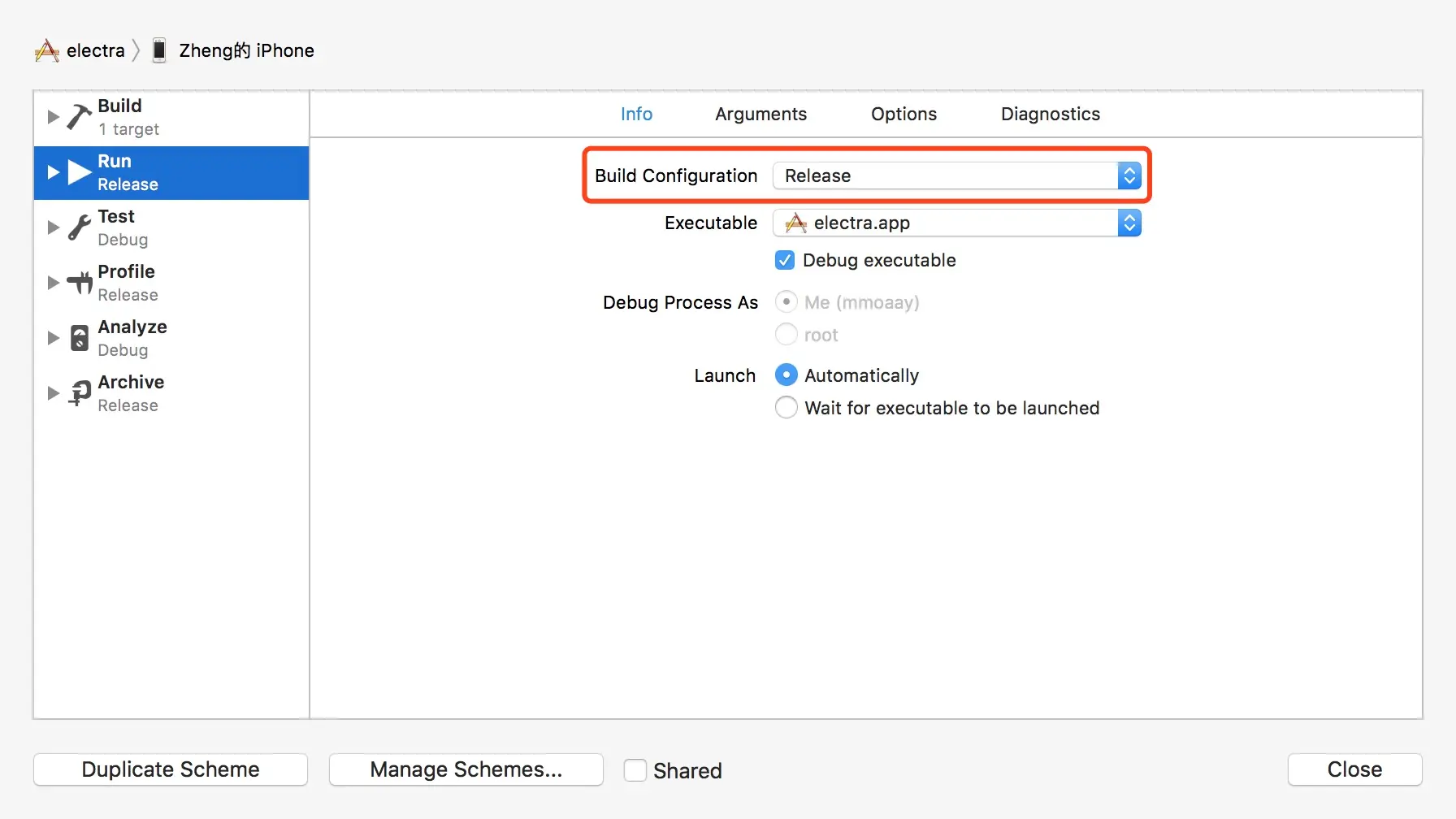 现在我们就可以用 Xcode 打开 Electra 并编译了,注意将编译方式设置成 Release: