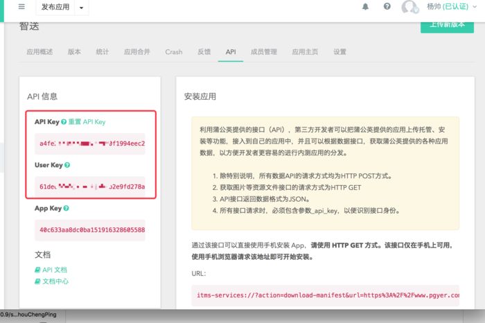 requests是一个网络请求的组件,我们可以把它类比为AFNetWorking,data是要传递的参数,files是要传递的文件,至于上传的参数key都是根据蒲公英提供的API来写的。上面的password代表安装app时所需要的密码,同时还有两个参数,USER_KEY和API_KEY,在蒲公英应用的位置可以找到,如图:
