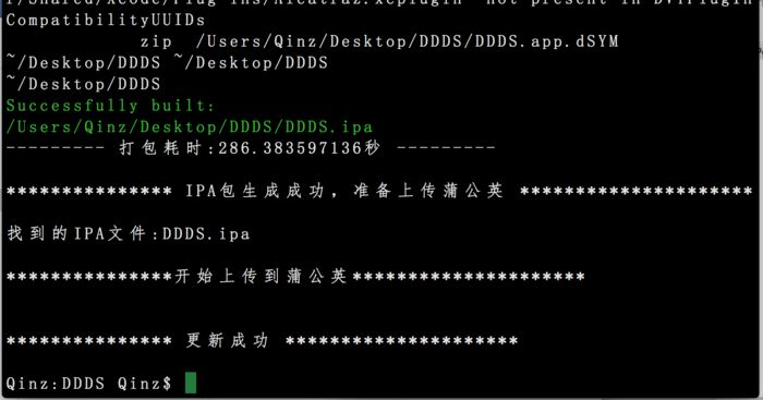 这里我主要是将shenzhen的打包命令"ipa build"封装在pythone脚本中,同时记录了打包的时间,经过测试打包的时间在4~7分钟左右,这个脚本中只需要配置蒲公英的USER_KEY和API_KEY,然后cd到当前工程目录,执行脚本即可!打包成功会在当前工程目录下生成ipa包和符号化文件!使用如下: