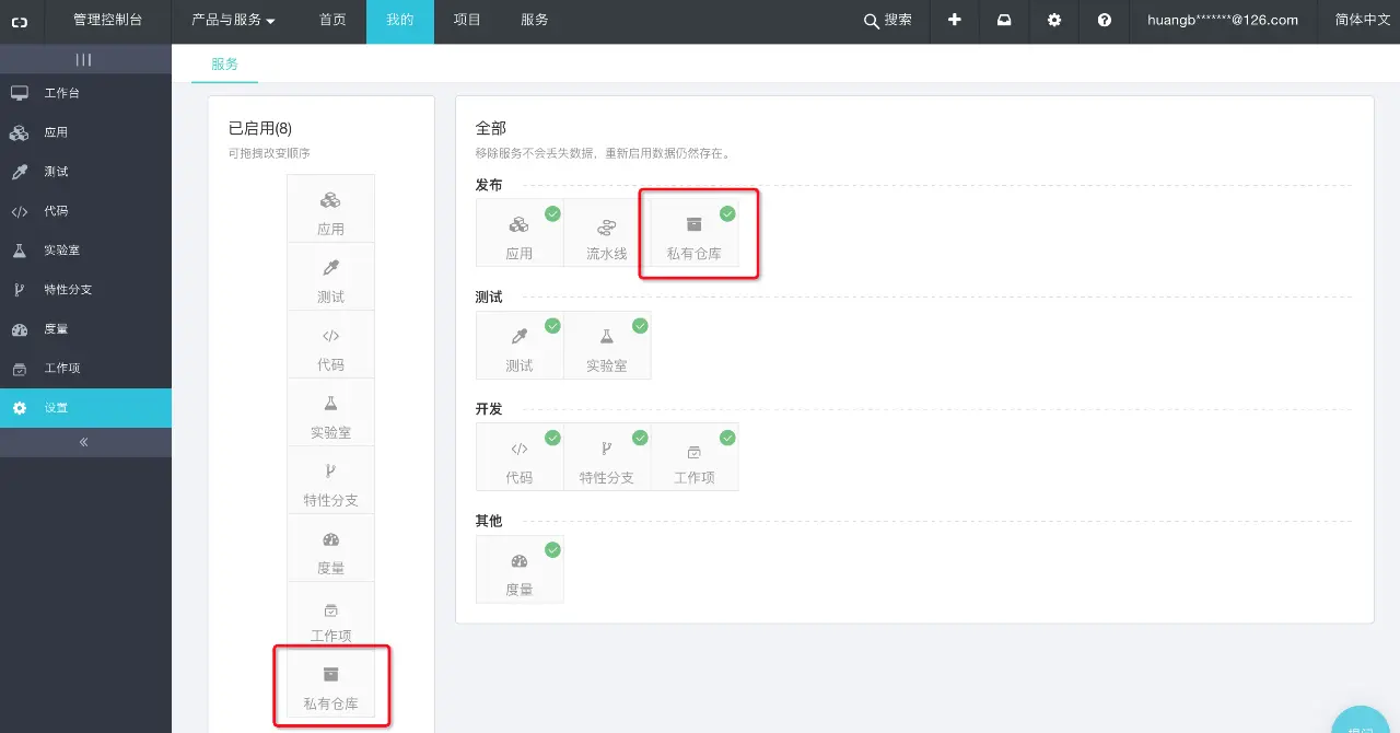 点击‘我的’链接,选择左侧菜单栏中的‘设置’按钮,将‘私有仓库’服务加入到左侧菜单栏中。