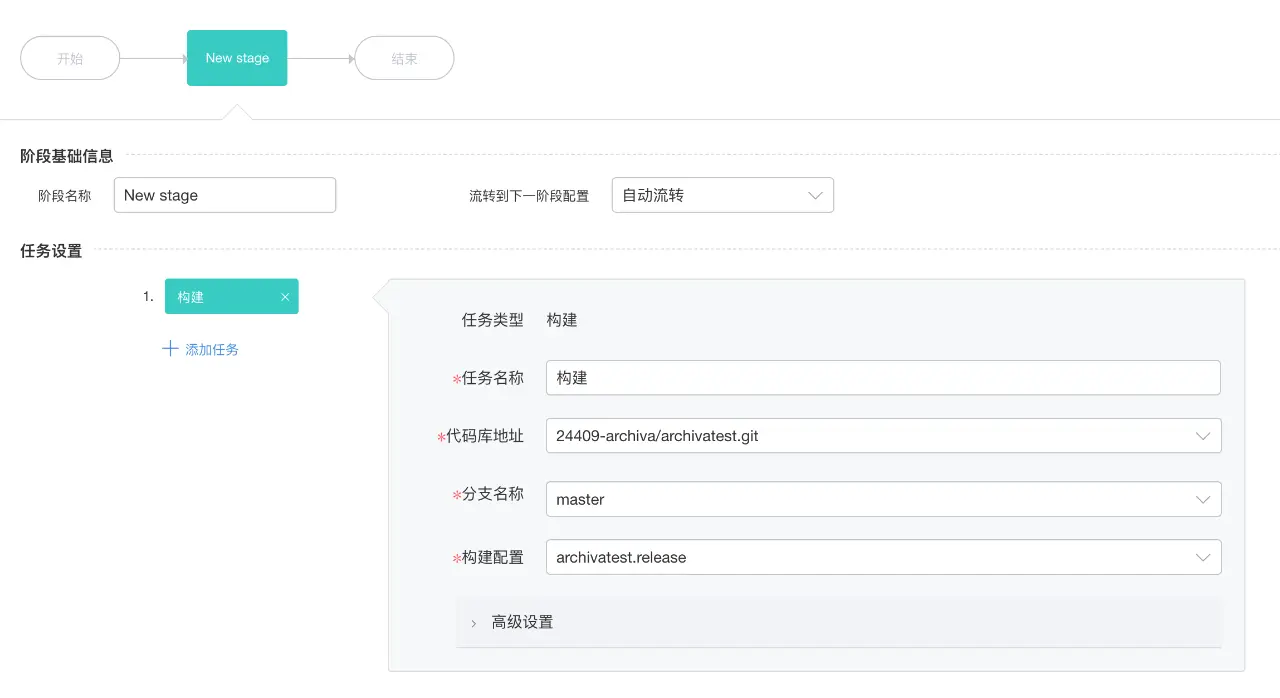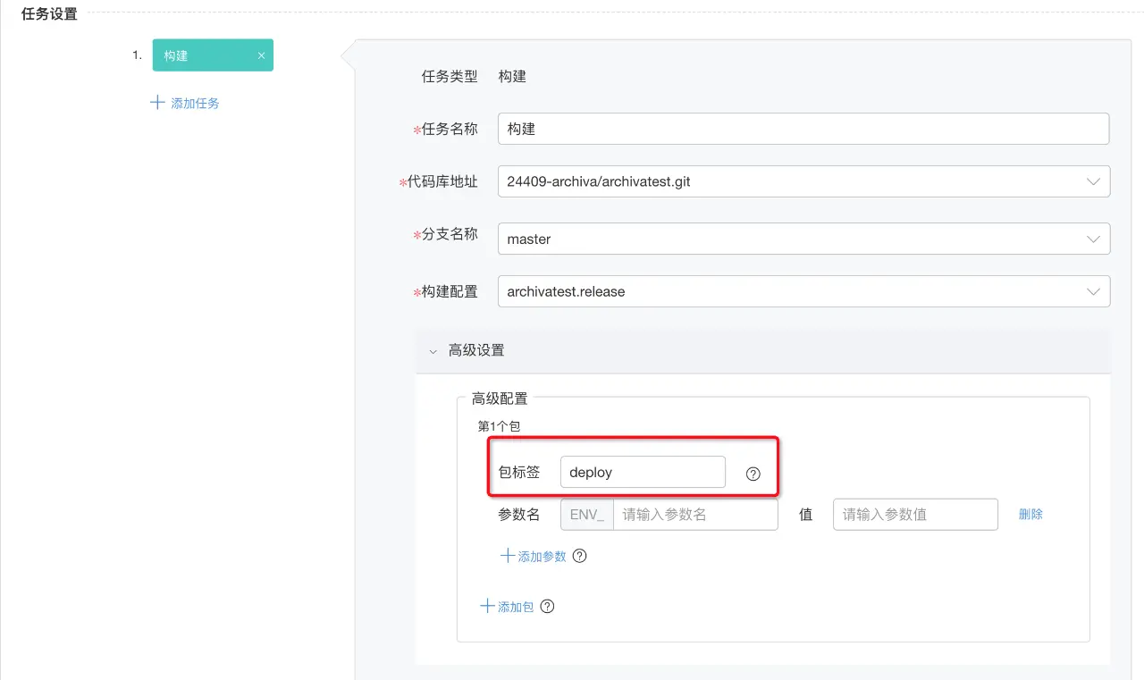 deploy.build.command=mvn -DaltDeploymentRepository=rdc-releases::default::https://repo.rdc.aliyun.com/repository/24409-release-87w1FL/ deploy -Dmaven.test.skip这个配置项使用前缀deploy作为包标签。然后创建一条流水线,在构建任务中打开高级配置项,进行如下配置: