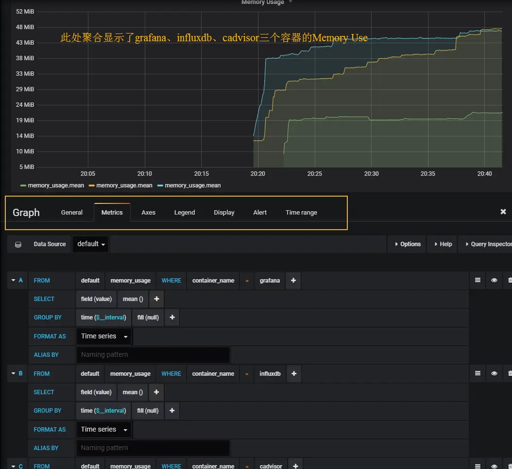 最后我添加了三个监控条件,分别用于监控grafana、influxdb和cadvisor三个容器的memory usage指标,并将其同时显示于图中,怎么样是不是很直观!