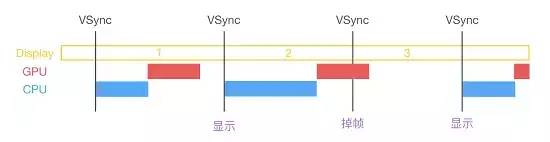 在VSync信号到来后,系统图形服务会通过CADisplayLink等机制通知App,App主线程开始在CPU中计算显示内容,比如视图的创建、布局计算、图片解码、文本绘制等。随后CPU会将计算好的内容提交到GPU去,由GPU进行变换、合成、渲染。随后GPU会把渲染结果提交到帧缓冲区去,等待下一次VSync信号到来时显示到屏幕上。由于垂直同步的机制,如果在一个VSync时间内,CPU或者GPU没有完成内容提交,则那一帧就会被丢弃,等待下一次机会再显示,而这时显示屏会保留之前的内容不变。这就是界面卡顿的原因。