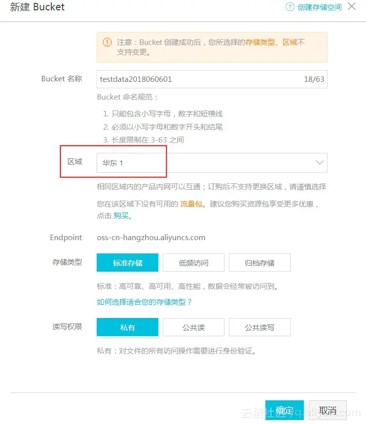 备注:Bucket名称是全局唯一,如果提示名称已存在,请更换一个Bucket名称。
