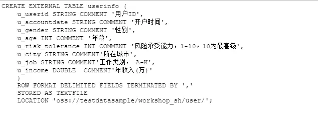 实验中,替换LOCATION 'oss://您的OSS存储空间名称/workshop_sh/user/'。 如:oss://workshopsh20180608100/workshop_sh/user