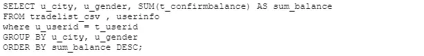 2.查询各城市、男性女性人群,购买的基金总额(多表Join查询)