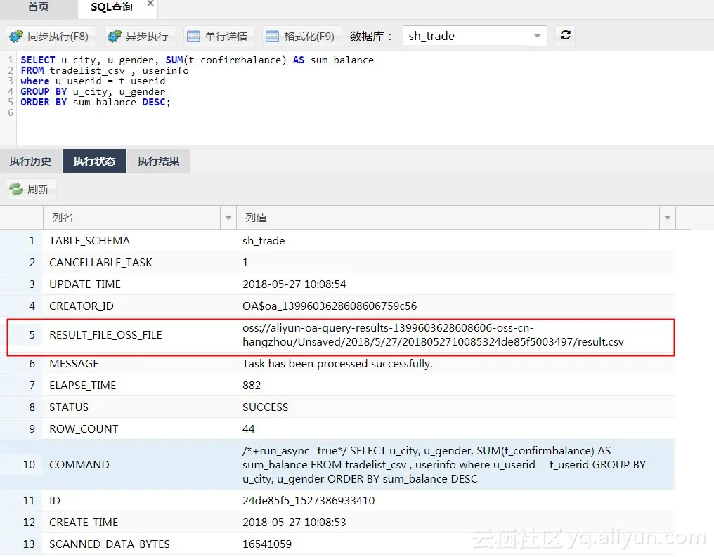 点击“刷新”,当STATUS变为“SUCCESS”时,可以查看到查询结果输出到OSS的文件路径。