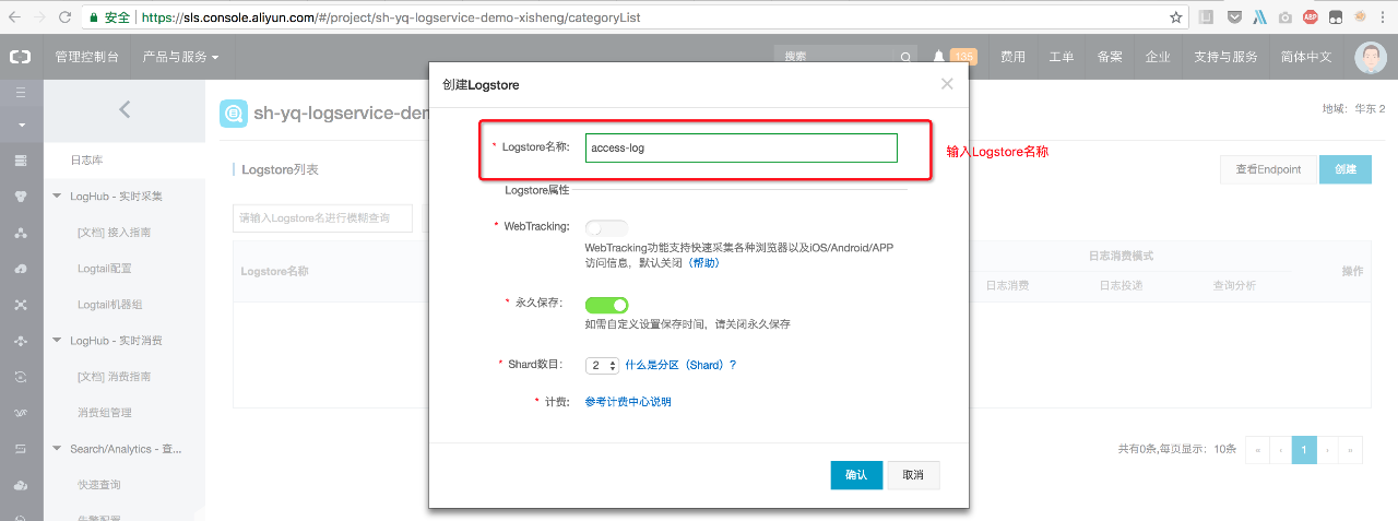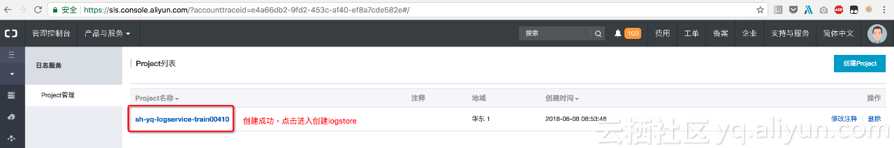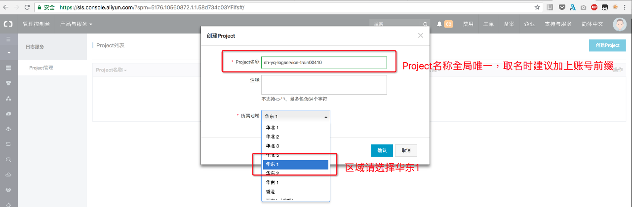 登陆日志服务控制台,选择华东1创建日志服务project,其中Project名称全局唯一,建议名称加上登陆账号前缀进行区别