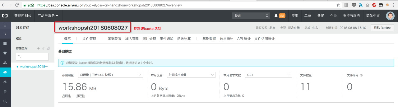 打开OSS控制台,可以看到一个以workshop名称开头的bucket,复制名称至“OSS Bucket”输入框