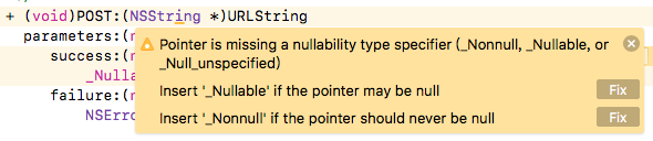 在@interface前加上NS_ASSUME_NONNULL_BEGIN,在@end后加上NS_ASSUME_NONNULL_END,可空的参数就给它加上nullable。