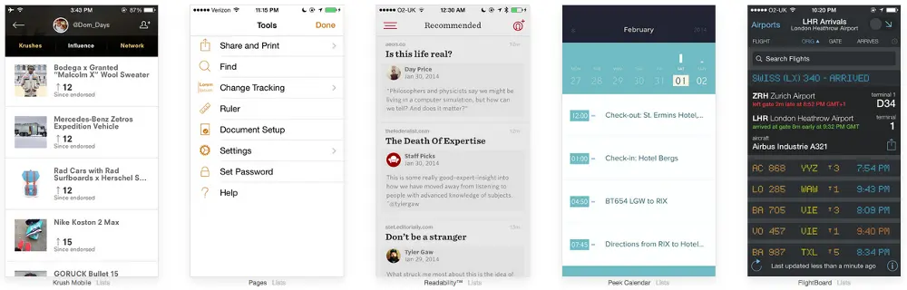 这里有一个列表的移动应用的截图。Pttrns 的好处是它整个网站是按照 —— 你懂得 —— UX 模式。这可以帮助你非常快速得搜索各种界面要素,无论你在做什么,管它是登录界面,用户信息,搜索结果,等等。