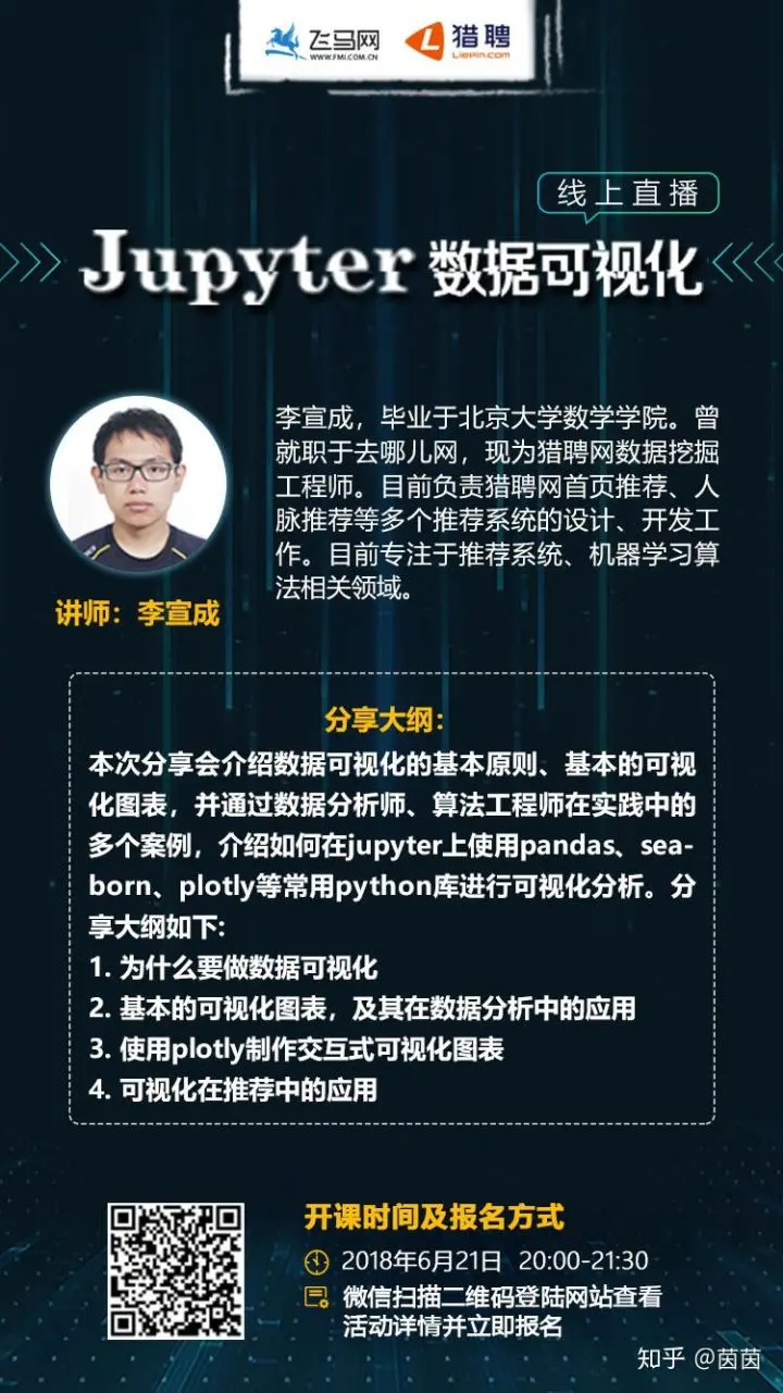 本次分享会介绍数据可视化的基本原则、基本的可视化图表,并通过数据分析师、算法工程师在实践中的多个案例,介绍如何在jupyter上使用pandas、seaborn、plotly等常用python库进行可视化分析。分享大纲如下:
