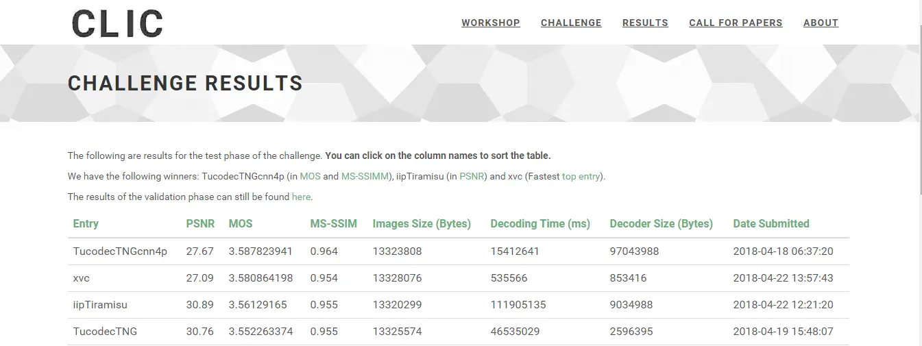 也应如此,CVPR作为一直关注计算机视觉领域发展的世界顶级学术会议,在今年,联合Google、ETH、Twitter、Amazon、Disney Research、Netflix举办了CVPR 2018的图像压缩挑战赛(CLIC)。目前该比赛已经落下帷幕,图鸭科技的Tucodec TNGcnn4p在该项挑战赛上取得MS-SSIM与MOS两项第一。