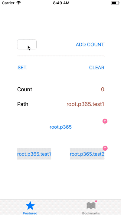 当App收到服务器推送有新内容更新时,需要对某个路径setBadge, 这边的setBadge会触发上面的observe block的回调。且如果消息为数量类型,比如未读消息时,还需要在setBadge的时候添加count属性。若用户点击了消息或进入了某个小红点提示的入口后,需要清除小红点消息,并且如果Observe的时候绑定了显示小红点的UI控件,也需要清除该控件上的小红点图标。