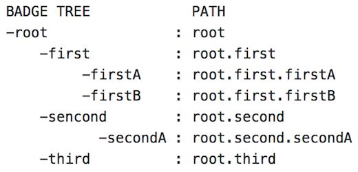 小红点所支持的路径格式设计为root.xx.xx, 小红点原则是父节点的小红点为子节点的小红点并集。root为默认的根路径。如下图所示, root.first为子路径, root.second为同级子路径。在纯红点模式下, root的小红点显示为root.first, root.second和root.third的并集,同理在数字显示模式下, root的badge数量为root.first, root.second和root.third的badge数量之和。而root.first的badge数量则又为root.first.firstA和root.first.firstB的和。