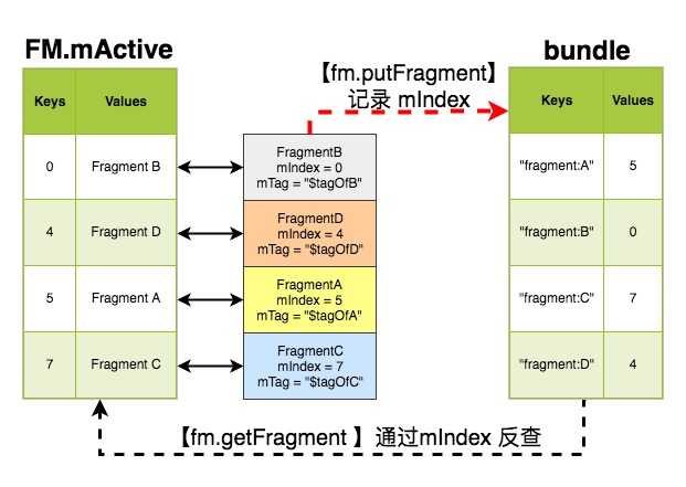 - 当存储状态的时候我们通过putFragment 记录下 FragmentA 的 mIndex, 使用的key 为字符串 "fragment:A"