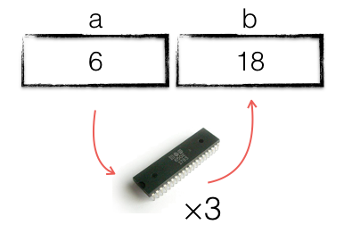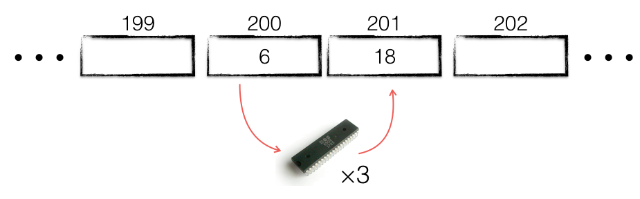 编写一段程序,检索出值并存储在地址为 200 的一个块内存中,将其乘以 3,并将结果存储在地址为 201 的另一块内存中,我们就可以像这样写一段伪代码: