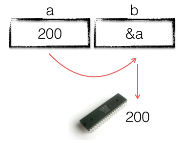 在 main 函数的第一行,我们定义了一个新的变量 a ,并赋值为 200。接下来我们定义了一个变量 b ,并将变量 a 的地址赋值给 b 。我们并不知道 a 的准确存储地址,但是我们依然可以将 a 的地址存储在变量 b 中。