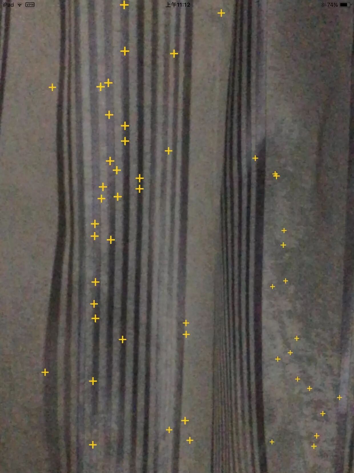 下面是我的 iPad 看向窗帘时的截图。可以看到织物有良好的纹理,所以追踪到了大量的唯一特征,每个十字都是 ARKit 找到的唯一特征。