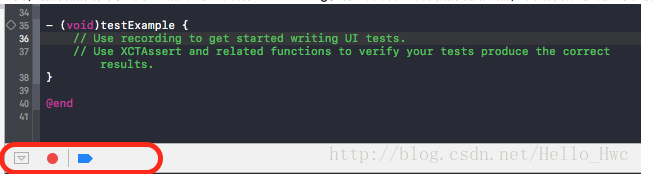Xcode7中新增了UI Test测试,UI测试是模拟用户操作,进而从业务处层面测试,常用第三方库有KIF,appium。关于XCTest的UI测试,建议看看WWDC 2015的视频 UI Testing in Xcode 。 UI测试还有一个核心功能是UI Recording。选中一个UI测试用例,然后点击图中的小红点既可以开始UI Recoding。你会发现:随着点击模拟器,自动合成了测试代码。(通常自动合成代码后,还需要手动的去调整)