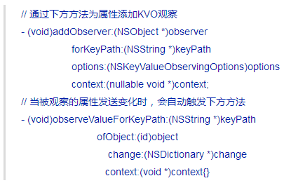 4). 观察者模式:KVO是典型的通知模式,观察某个属性的状态,状态发生变化时通知观察者。