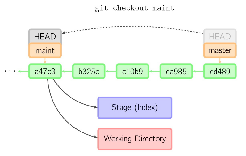 一般我们会使用命令 git checkout <branch_name> 来切换分支,HEAD 就会移动到指定的分支上。