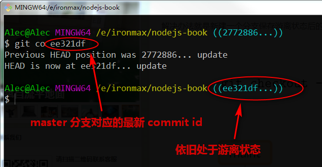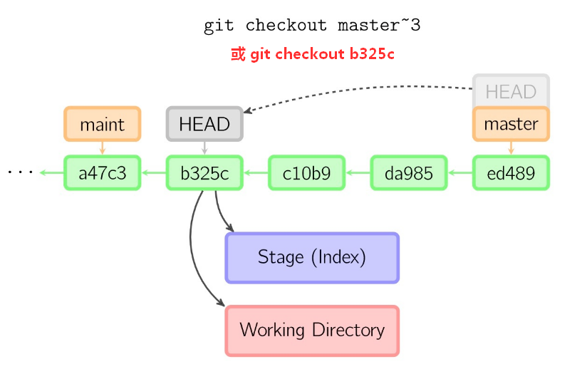 如果不做任何修改,想回到 master 分支,直接 git checkout master 即可,而不要 checkout master 主干所对应的 <commit id>。