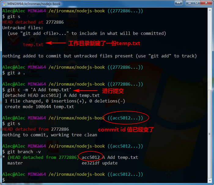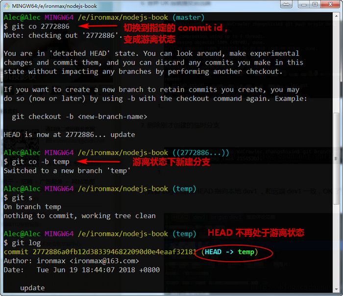 顺利回到主干的话,HEAD 的游离状态会取消,原临时游离分支也会消失。