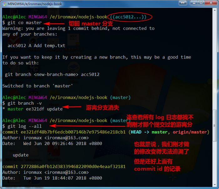 切换会 master 分支时,在游离状态所做的修改和提交无法追溯: