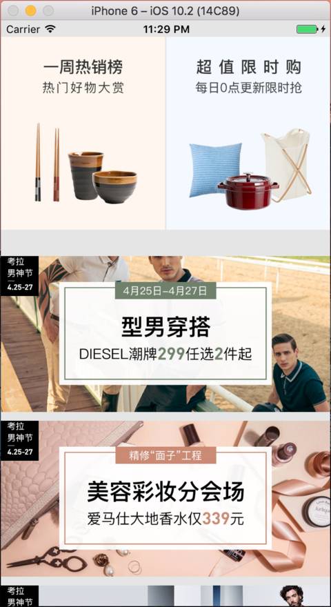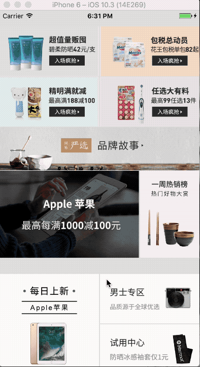 页面动态化主要的使用场景是app的电商页面,由于电商的业务需求较大,经常会需要改变各个banner的样式来满足业务的需求,所以需要客户端根据数据实时更新样式,下面说说我对页面动态化的理解跟思路。先看一下最后demo的效果: