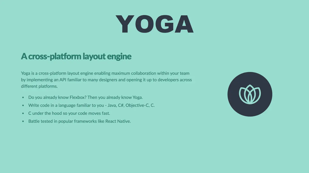 Yoga本是Facebook在React Native里引入的一种跨平台的基于CSS的布局引擎,它实现了Flexbox规范,完全遵守W3C的规范。随着该系统不断完善,Facebook对其进行重新发布,于是就成了现在的Yoga(Yoga官网)。