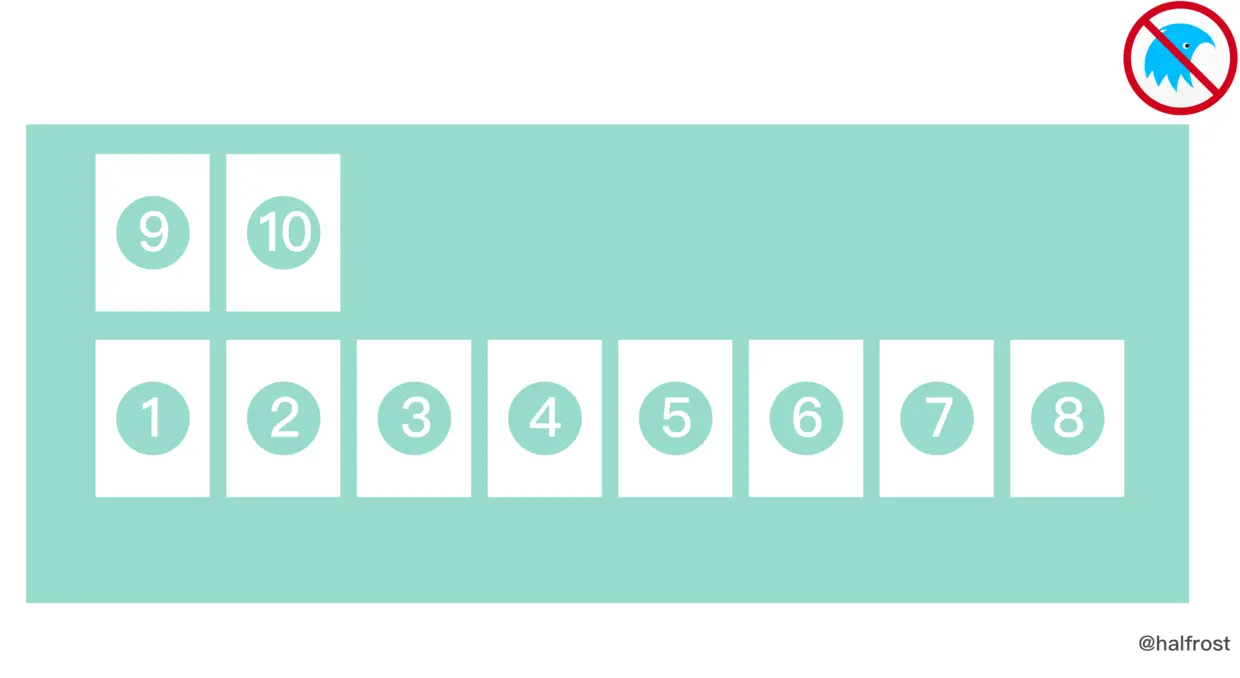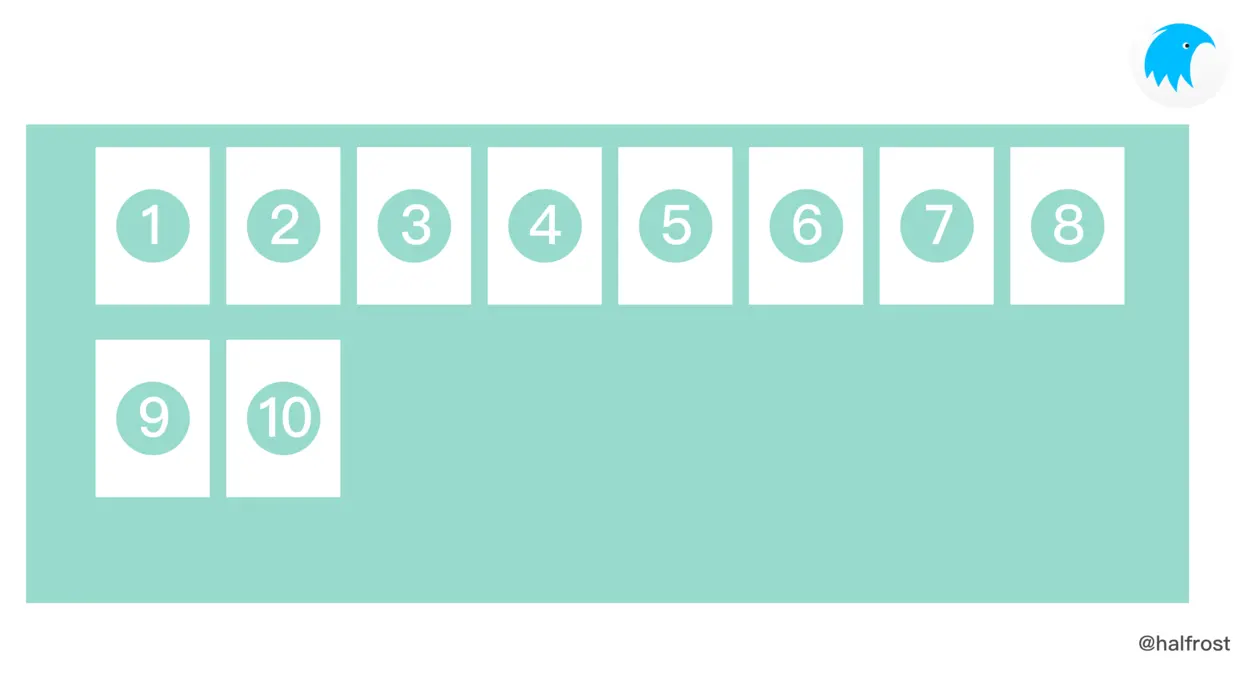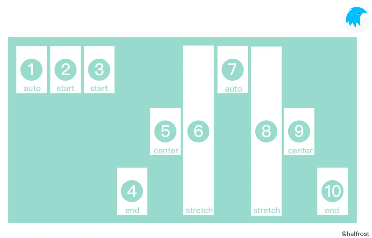侧轴起点(cross-start)和侧轴终点(cross-end):子视图行的配置从容器的侧轴起点边开始,往侧轴终点边结束。