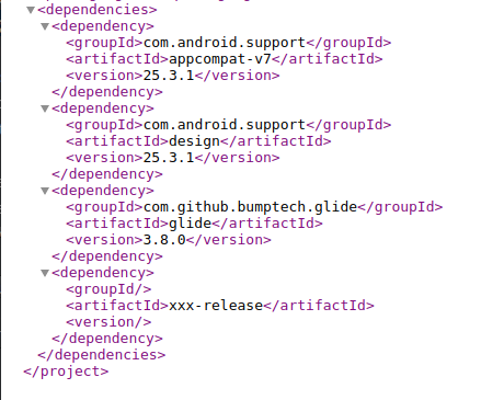 实际操作过程中,笔者发现,我们本地实际是有依赖本地第三方的aar包的,换句话说,并非所有的库都是远程依赖,你会发现,原来脚本居然会将本地依赖的aar文件,也合并到pom.xml文件中,继而发布到nexus私服上去了,这个时候给别人远程依赖,就会一直找不到相关的本地库