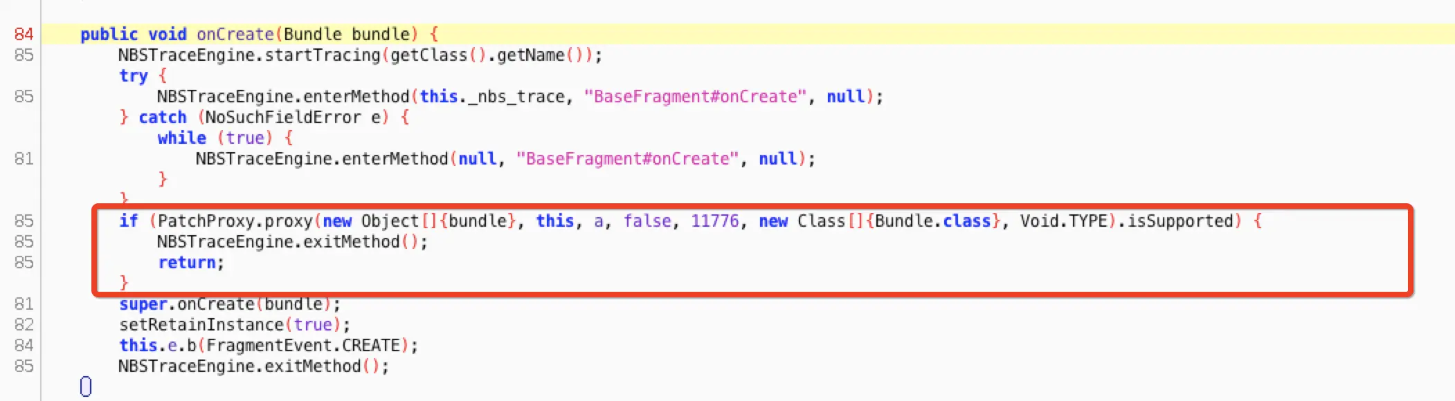 分析下需要替换的 super 的方法,这个方法实际上是 Aspectj 处理后的方法,根据上面分析的 Aspectj 的调用流程得知,该方法实际上是 onCreate 方法原始的逻辑,反编译出来如下: