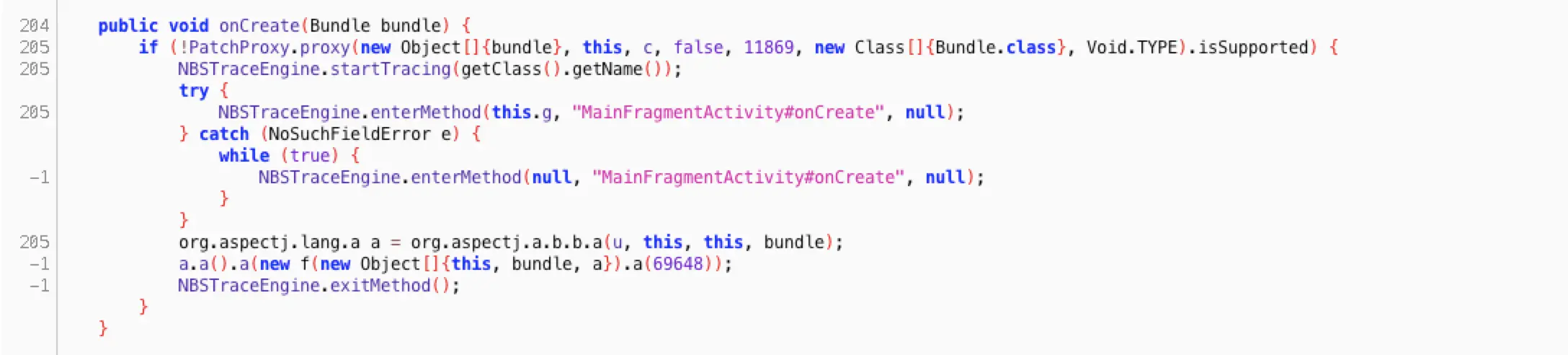 如果 robust Plugin 是先于其他插件执行的,那么会出现 Robust 插入代码后,再执行其他插件的代码逻辑,这样会有问题吗?其实要具体问题具体分析,可能会有问题,也可能没有问题。举个例子,我们项目中使用了听云,而且是较老的版本(2.5.9),其插件内部插入代码没有用到 Transform,而是用了另外一种技术,其会导致不管在哪里声明插件,其处理顺序都是最后执行,那么对于 Robust 基线包插件来说,当基线包插件插入完代码后,又会去执行听云插件的插入代码逻辑,所以可能会看到以下这种代码: