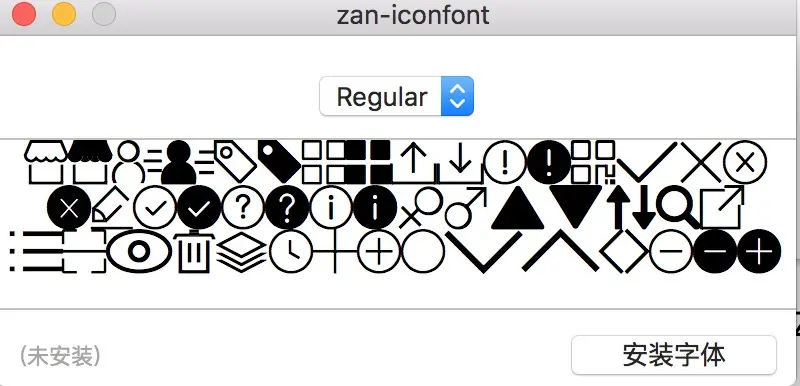 可以看出来,其实都是一些基础通用icon,这些icon复用率非常高,如果你们公司有多个App,复用这一个字体文件就可以快速使用图标而不需要各种拷贝图片资源了。我们最终需要的是一个包含所有图标的字体文件即ttf文件,使用过自定义字体的开发者应该都知道ttf(TrueType font),我们在电脑上是可以直接双击ttf文件安装字体使用的。如下图