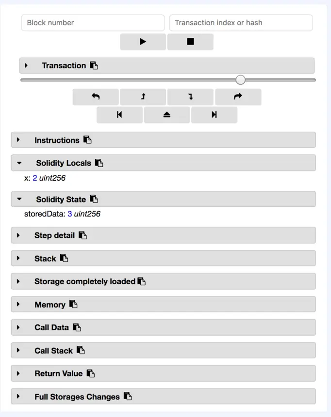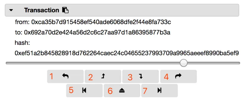 Transactions: 可以查看交易及交易的执行过程,并且提供了7个调试的按钮,如下图: