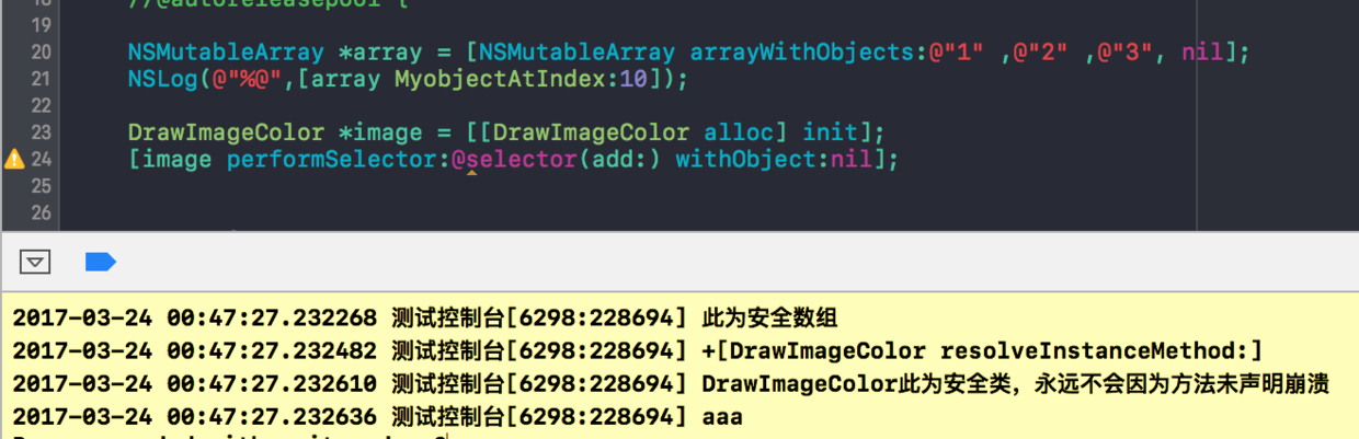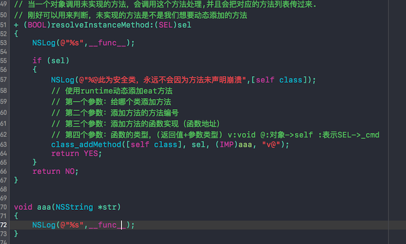 在这里就会多这么一句代码,这里也可以用来做动态添加方法的功能,不过现在不说这个功能,我就是想实现它不崩溃,所以如上图就使用class_addMethod添加一个已经实现的方法,注意这个方法要是C语言的形式去实现的,然后就不会崩溃了,大家可以试一下,我在想,如果写一个NSObject的分类,把这些方法用到NSObject的分类里去,那样会不会所有的类都不会因为方法未声明崩溃了呢?😃