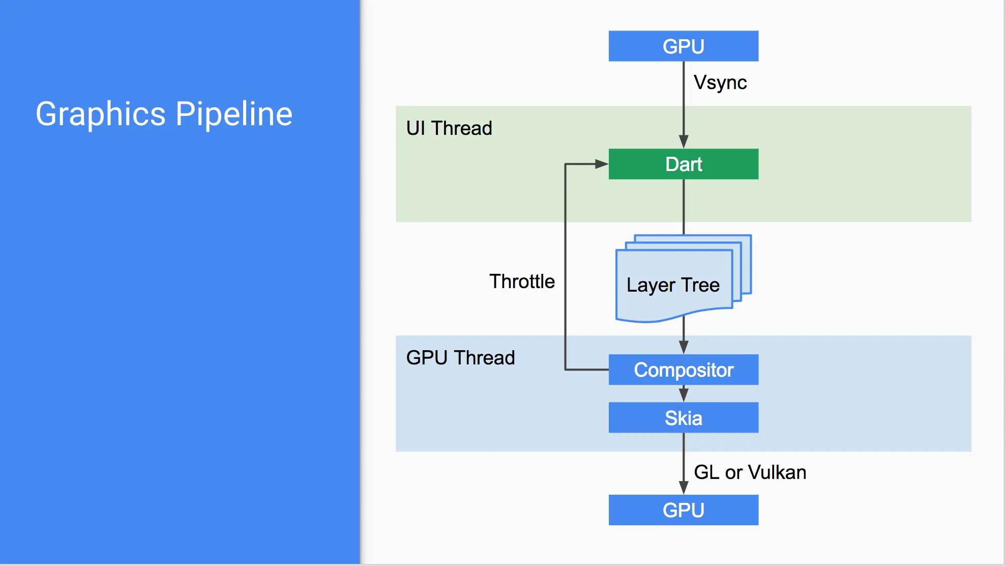 Flutter Engine: 这是一个纯 C++实现的框架层,包含了 Skia引擎(高性能渲染引擎)、Dart运行环境、文字排版引擎等。它可以以 JIT、JIT Snapshot 或者 AOT(预先编译)的模式运行 Dart代码。AOT直接将Dart源码编译成了本地字节码,没有了解释执行的过程,提升执行性能。和Java显著不同的是Dart的"线程"(Isolate)是不共享内存的,各自的堆(Heap)和栈(Stack)都是隔离的,彼此之间通过消息通道来通信。所以,Dart不存在数据竞争和变量状态同步的问题,整个Flutter Framework Widget的渲染过程都运行在一个isolate中,在代码调用 dart:ui库时,提供 dart:ui库中 Native Binding 实现。 这个运行时还控制着 VSync信号的传递、GPU数据的填充等,并且还负责把客户端的事件传递到运行时中的代码。
