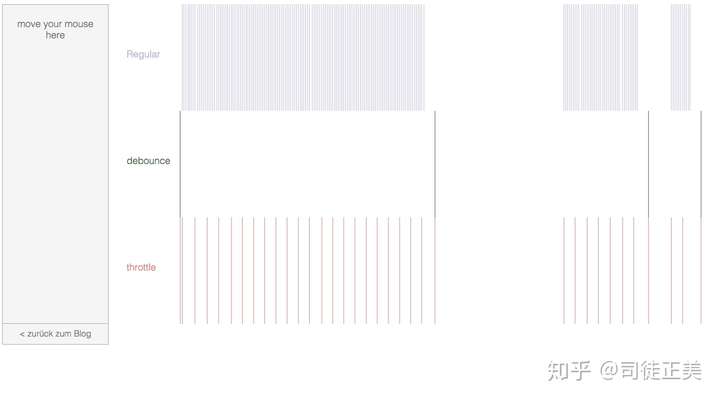 如果还是不能完全体会 debounce 和 throttle 的差异,可以到 这个页面 看一下两者可视化的比较。