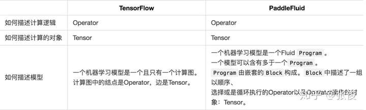 下面的表格总结了 TensorFlow 和 PaddleFluid 在描述机器学习模型上的不同设计选择。可以看到,Operator和Tensor这些构成模型的基础元素在两个平台中是相似的。如果有任一个平台的使用经验,可以非常快速的将这些概念在不同平台之间类比推广。